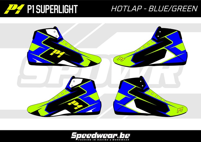 P1 CustomDesign Schoen HOTLAPS Blauw combineert topkwaliteit FIA 8856-2018 gehomologeerde raceschoenen met de creatieve kracht van het Speedwear design team. Kies uit een reeks vooraf ontworpen stijlen of ga voor een volledig gepersonaliseerd ontwerp dat perfect aansluit bij jouw teamkleuren, sponsorbranding of persoonlijke voorkeur.