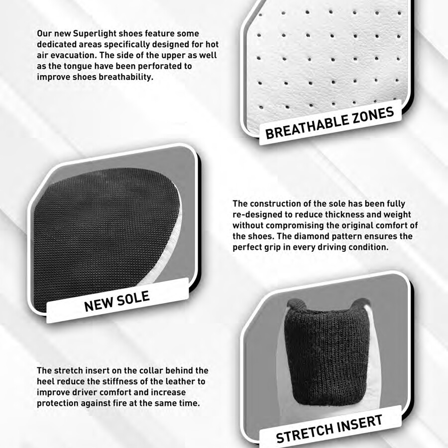 Onze nieuwe superlichte schoenen hebben een aantal speciale gebieden die speciaal zijn ontworpen voor hete lucht afvoer. De zijkant van het bovenwerk en de tong zijn geperforeerd om het ademend vermogen van de schoenen te verbeteren. De constructie van de zool is volledig opnieuw ontworpen om de dikte en het gewicht te verminderen zonder afbreuk te doen aan het oorspronkelijke comfort van de schoenen. Het ruitpatroon zorgt voor de perfecte grip in alle rijomstandigheden. Het stretch-inzetstuk op de kraag achter de hiel vermindert de stijfheid van het leer om het comfort van de bestuurder te verbeteren en tegelijkertijd de bescherming tegen vuur te vergroten.