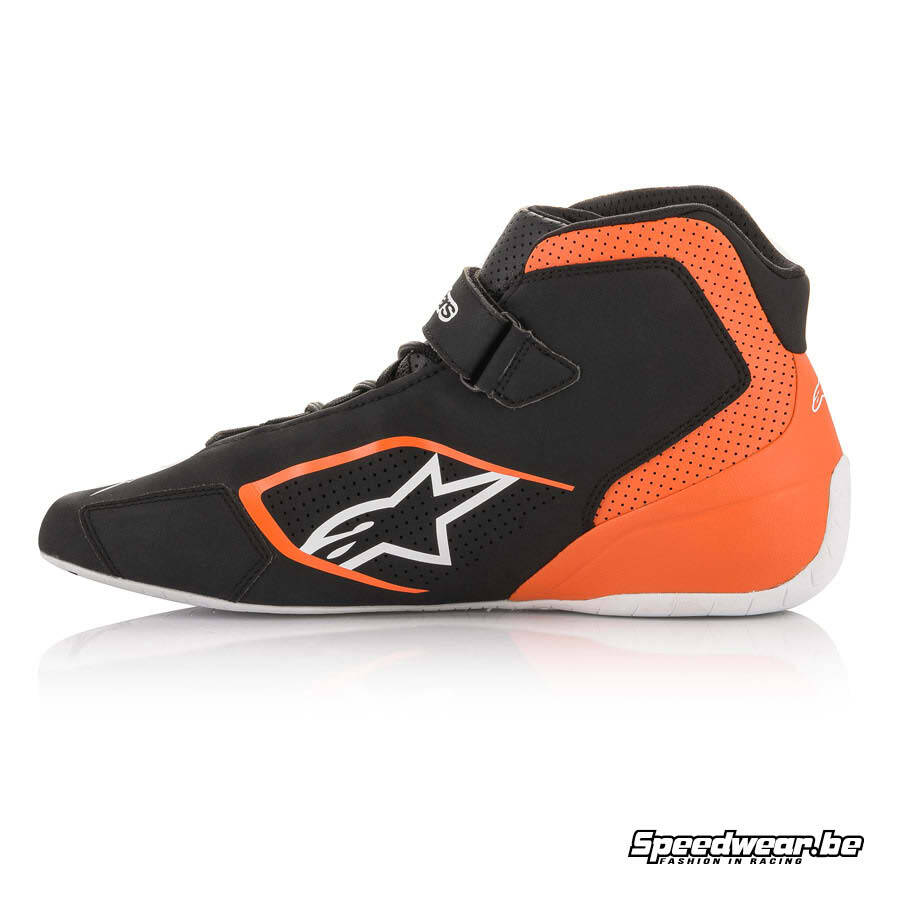 Alpinestars Tech 1 K schoen voor karts – Zwart Oranje Wit is een schoen speciaal ontwikkeld voor de kartsport met veters als sluitingsmechanisme. Op de hiel is een extra patch voorzien voor extra bescherming.